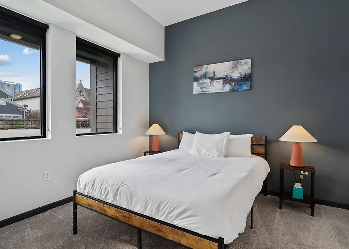 O apartamento Cozysuites Mass With Parking Lounge & Roof Deck #23 oferece cozinha totalmente equipada, bem como quartos com mesa de trabalho, máquinas de café/chá e Internet de banda larga. Localizado a 300 metros de James Whitcomb Riley Museum and Historical Marker, está a apenas a 450 metros de parragem de autocarro Delaware and New York Super.